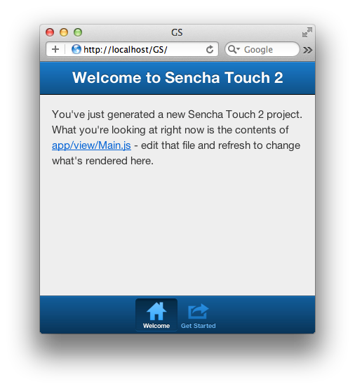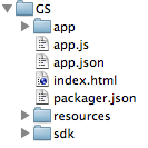 2.[INFO] Created file /Users/nickpoulden/Projects/sencha/GS/.senchasdk3.[INFO] Created file /Users/nickpoulden/Projects/sencha/GS/index.html4.[INFO] Created file /Users/nickpoulden/Projects/sencha/GS/app.js5....這將會產生一個叫做GS的Sencha Touch應用骨架,放在../GS目錄下。骨架應用中包含了所有你創建一個Touch應用所需要的東西,包括默認的index.html,一份Touch SDK的拷貝,CSS,圖片和打包你的應用所需的配置文件。