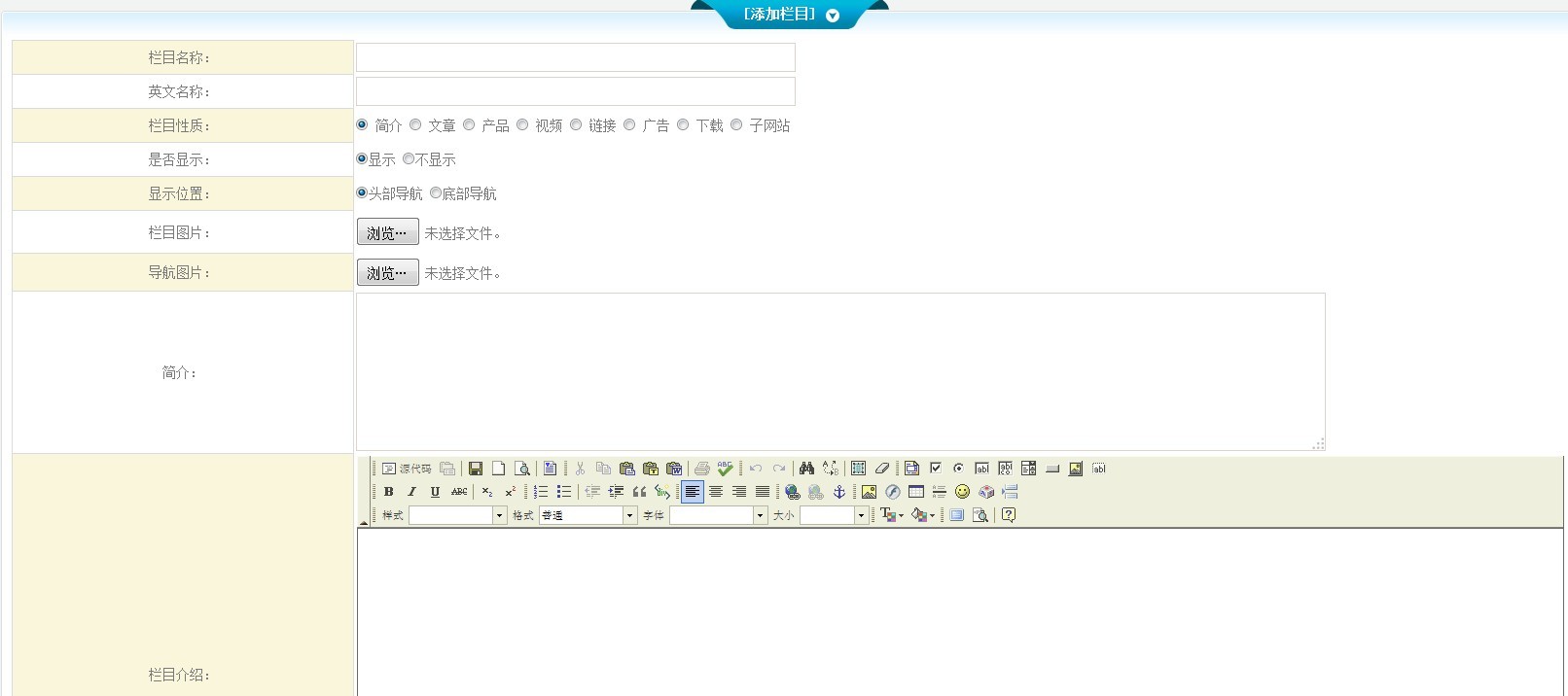 1、將您要添加的欄目名稱、英文名稱、欄目圖片、導(dǎo)航圖片、簡(jiǎn)介、欄目介紹等填寫(xiě)完成。