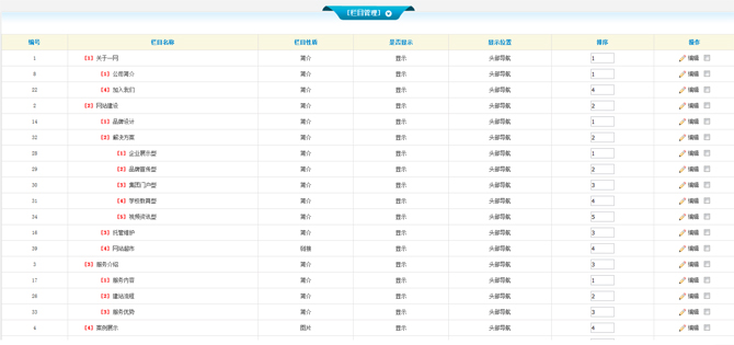 如果你想修改某個(gè)欄目名稱、欄目性質(zhì)、是否顯示、顯示位置、排序和操作等信息,您只需要在欄目最右邊的操作中,點(diǎn)擊編輯就可以進(jìn)行操作了。當(dāng)然如果你想刪除某個(gè)或者某些欄目,你可以選擇想要?jiǎng)h除的欄目,點(diǎn)擊下面的刪除按鈕!