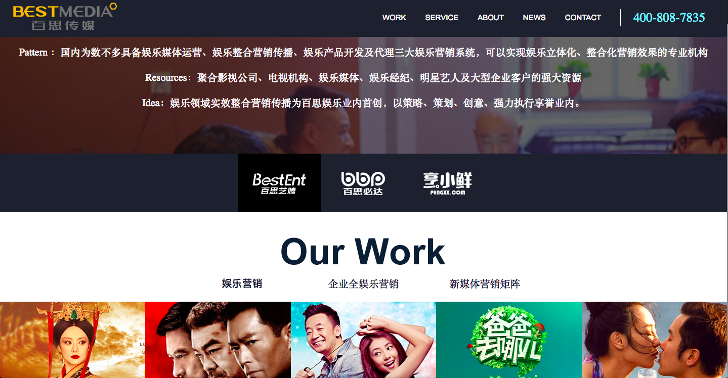 百思傳媒始創于2011年11月11日,以整合營銷為起點,形成實效整合營銷傳播、電影營銷、電視劇營銷、綜藝節目營銷、娛樂新媒體經營、影視內容出品事業群,成為以用戶思維、市場導向的營銷型娛樂傳媒集群。