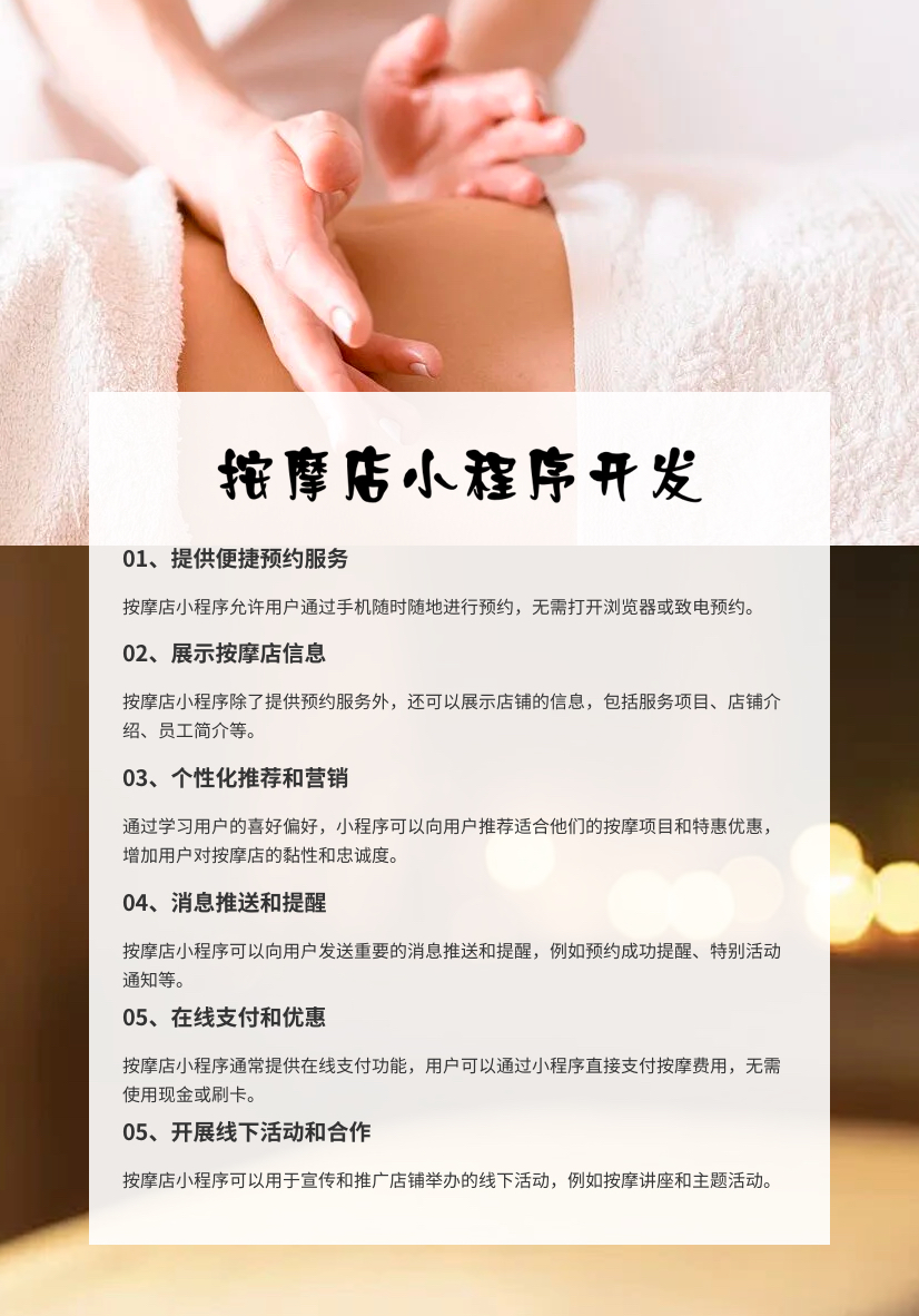 在快節(jié)奏和高壓社會(huì)中,按摩已成為許多人緩解壓力和保持健康的重要方式,各地的按摩店也是隨處可見(jiàn),而為了能夠更好地提供服務(wù),很多按摩店都引入了小程序應(yīng)用。