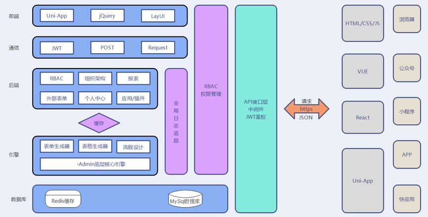 12 布局:采用響應式布局,能夠支持PC、移動端的瀏覽和管理、自定義主題皮膚、支持夜間模式、支持3種(傳統、菜單、分欄)菜單模式、支持4種(方格、圓點、卡片、圓滑)視圖模式、支持7種(新窗口、彈窗、抽屜、選項卡、獨立窗口、異步請求、自定義事件)菜單打開方式。